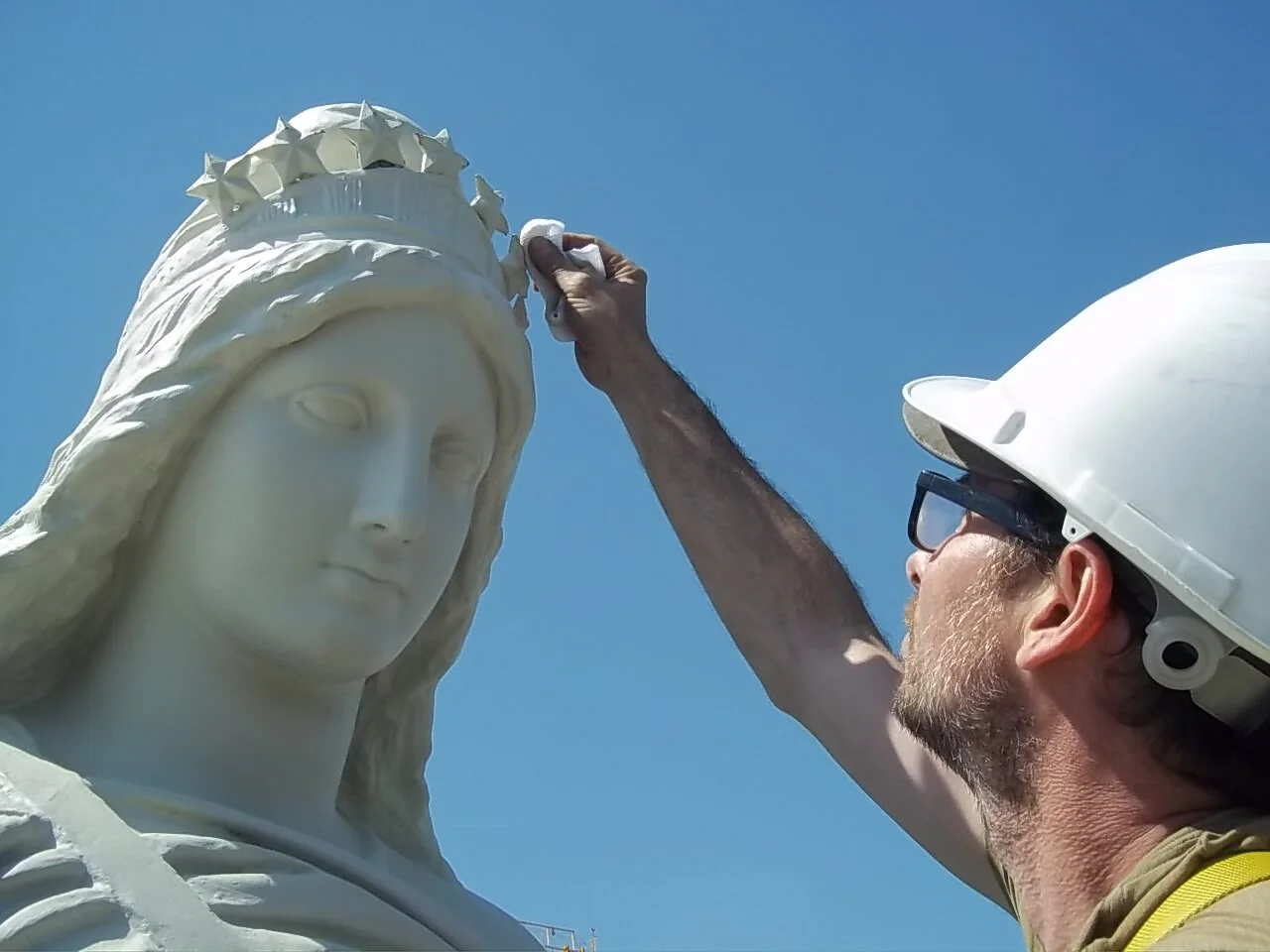 Kreilick Conservation, LLC was selected to conserve the sculptural group off-site to facilitate the replacement of a cracked plinth. The sculptural elements were removed on February 8th, 2012 and transported to a facility in Swedesboro, NJ for treatment. All existing coatings were removed. Cracks and open seams were closed. Internal stainless steel frames from earlier work were modified to make the sculptures more earthquake and wind-resistant. Large cast aluminum plates were designed to relieve stress by sandwiching the brittle zinc between the new plates and the existing stainless steel frames. A new coating system was selected to be maintainable, and reversible, if necessary. The color, a yellowish-white (Munsell No. 5Y 8.5/1) was based on an earlier analysis of the historic paints. The sculptures were re-installed in May 2013.