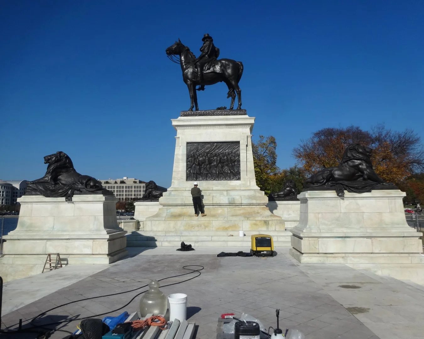 Kreilick Conservation, LLC was retained to conserve all of the bronze work, and to provide limited treatment of the Vermont white marble pedestals. All of the bronze was cleaned using an IBIX micro-abrasive cleaning system utilizing calcium carbonate media at very low pressure. All of the bronze surfaces were patinated to match existing examples of the sculptor’s other work, and an unaltered surface discovered on this sculpture. All bronze surfaces were protected with the application of Incralac. More than one hundred missing bronze elements (swords, scabbards, rifle barrels, horses’ reins, etc.) were replicated in cast bronze following extensive research and modelling of original equipment, and by taking molds of extant examples. The seven marble pedestals were poulticed to remove cupric staining and repointed.