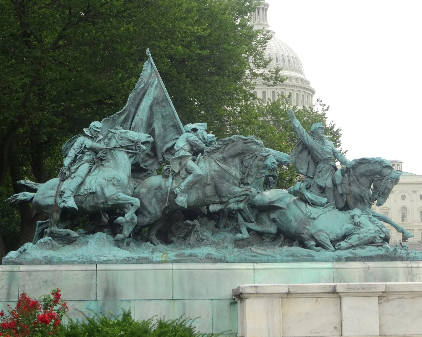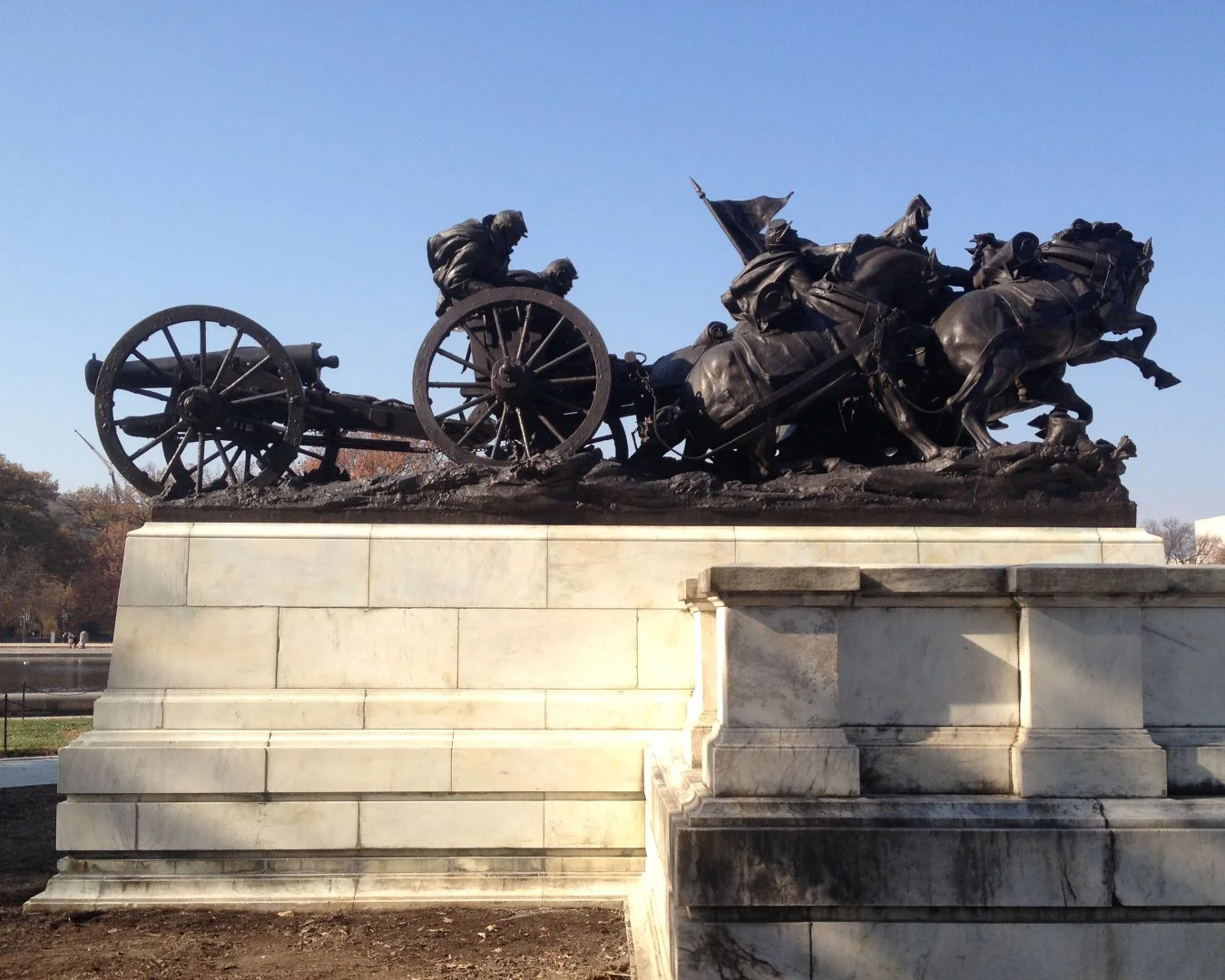 The General Ulysses S. Grant Memorial, dedicated in 1920, is the largest bronze sculptural group in Washington, DC. The figure of Grant and his horse is 2-½ times life-size, and is one of the largest bronze equestrian sculptures in the world. The dynamic end groups of Cavalry and Artillery incorporate twelve (12) life-sized horses, thirteen (13) life-sized soldiers, and a complete 1857 12# Napoleon cannon and limber. Four large reclining lions and two 9-ft. by 7-ft. plaques complete the assemblage. The sculpture commission was the largest to-date, and took sculptor Henry Shrady 20 years to complete.