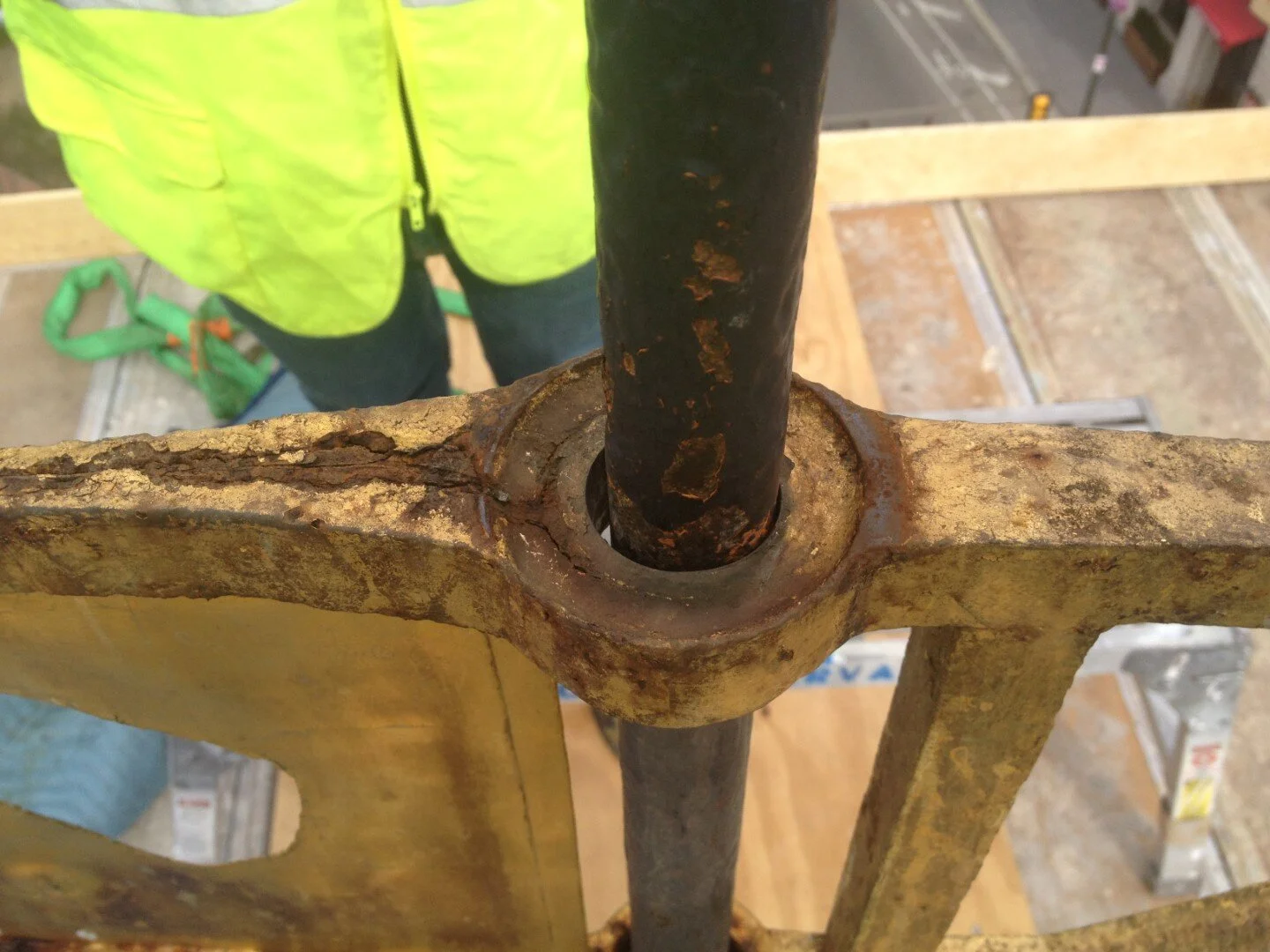 The weather vane, time ball, and finial were disassembled and transported to Kreilick’s conservation studio for treatment. The weathervane is 86-1/4” long and 21-5/8” top to bottom at the spindle. The finial is 22-1/2” tall, and the time ball is 21.5” in diameter. The frame of the weather vane is iron, the infill panel is sheet copper, and the bearing rings are brass. The finial is sheet copper with a thick brass base. The time ball is sheet copper reinforced with brass at the top and bottom. The weather vane, time ball, and finial were repaired and re-gilded following the removal of deteriorated earlier gilding. Once restored, the weather vane, time ball and finial were returned to the site and reinstalled.