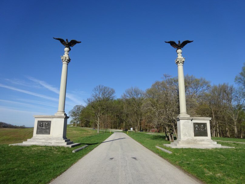 The Pennsylvania Columns, completed in 1912, honor the soldiers from Pennsylvania who served at Valley Forge during the 1777-1778 winter encampment. The two round columns with Corinthian capitals and rectangular plinths are constructed of Barre granite. Each column is topped by a bronze eagle, and each plinth has two bronze plaques with bas reliefs of officers from Pennsylvania. The bronze-work was sculpted by Henry Kirke Bush-Brown. The granite and bronze had started to deteriorate due to exposure to the elements. Significant cracks in the granite plinth had caused large pieces to become detached. The columns are approximately 32 feet high and 15-ft. x 7.5-ft. at the base.