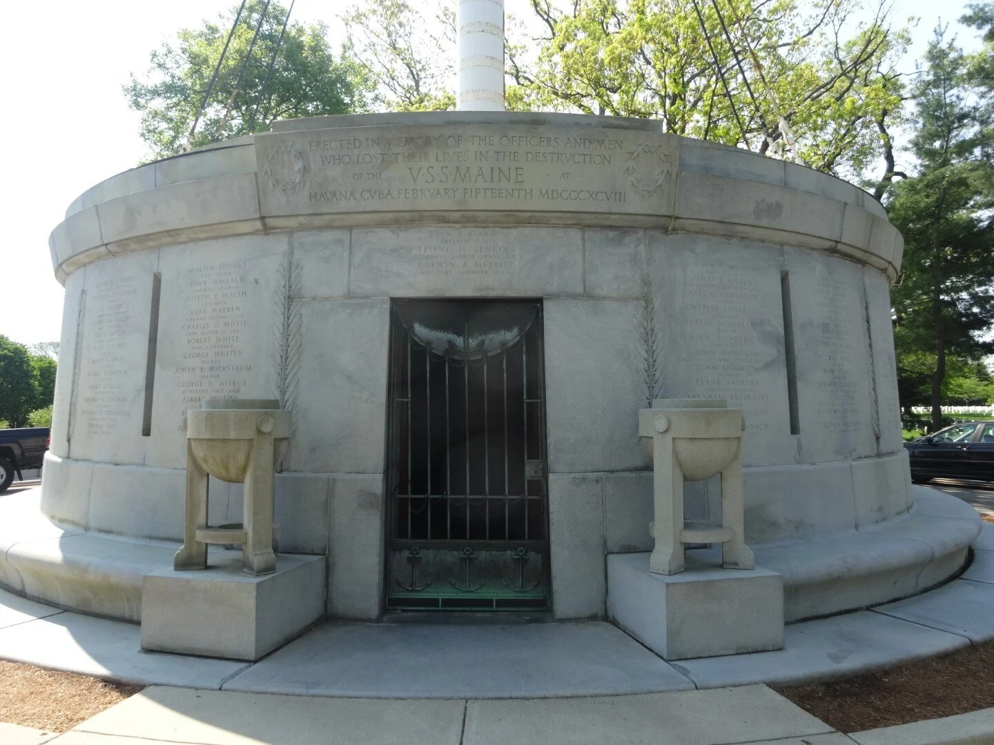 Construction of the battleship U.S.S. Maine was completed in 1894. The ship was sunk in Havana Harbor on February 15th, 1898 resulting in 266 fatalities. Salvage operations took place in 1912. In 1915, a memorial was erected in the Arlington National Cemetery. The original main mast, the ship’s bell, and an anchor are incorporated into the memorial.