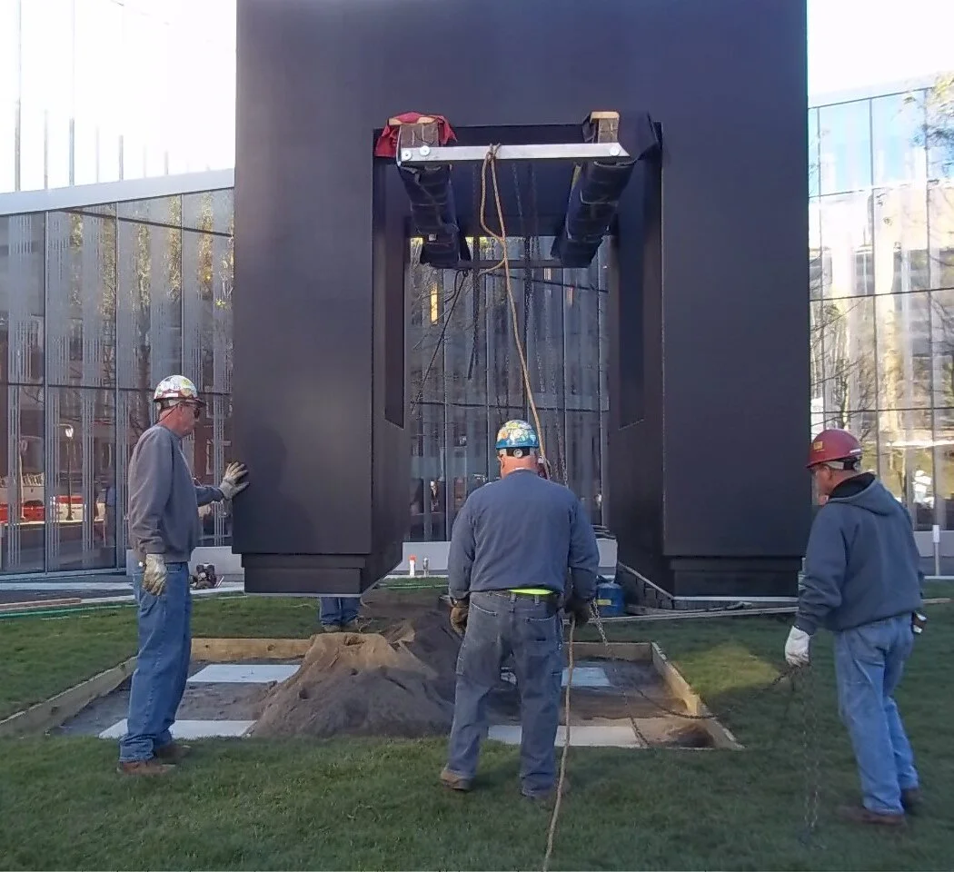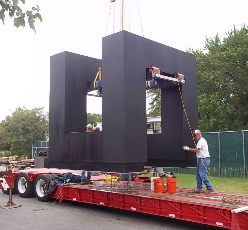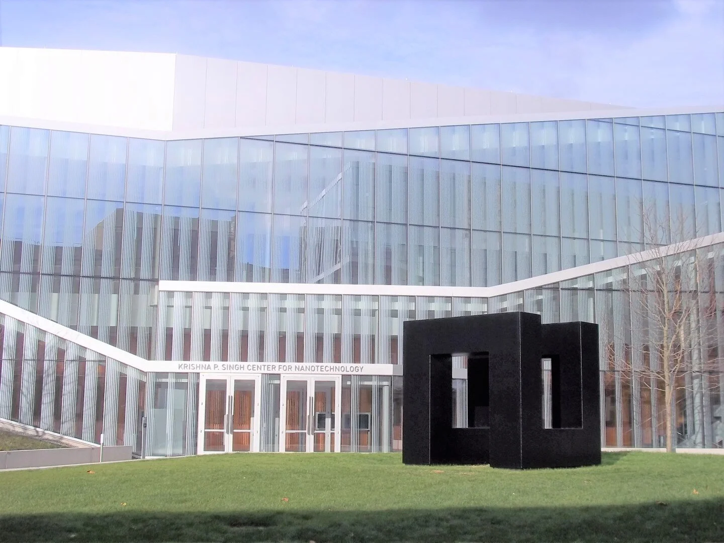 The bottoms of the sculpture were cleaned by air-abrasive blast cleaning and then metallized with aluminum, primed, and painted. New bases were fabricated, primed, painted, and attached to the bottoms of the sculpture. An access panel was cut in the bottom of the sculpture to facilitate the attachment of the bases. Zinc granules were distributed on the interior horizontal surfaces to inhibit corrosion due to moisture condensation. All exterior surfaces were air-abrasively blast cleaned, primed, and painted. On September 13th, 2013, the sculpture was placed in front of the new Krishna P. Singh Center for Nanotechnology on the campus of the University of Pennsylvania.